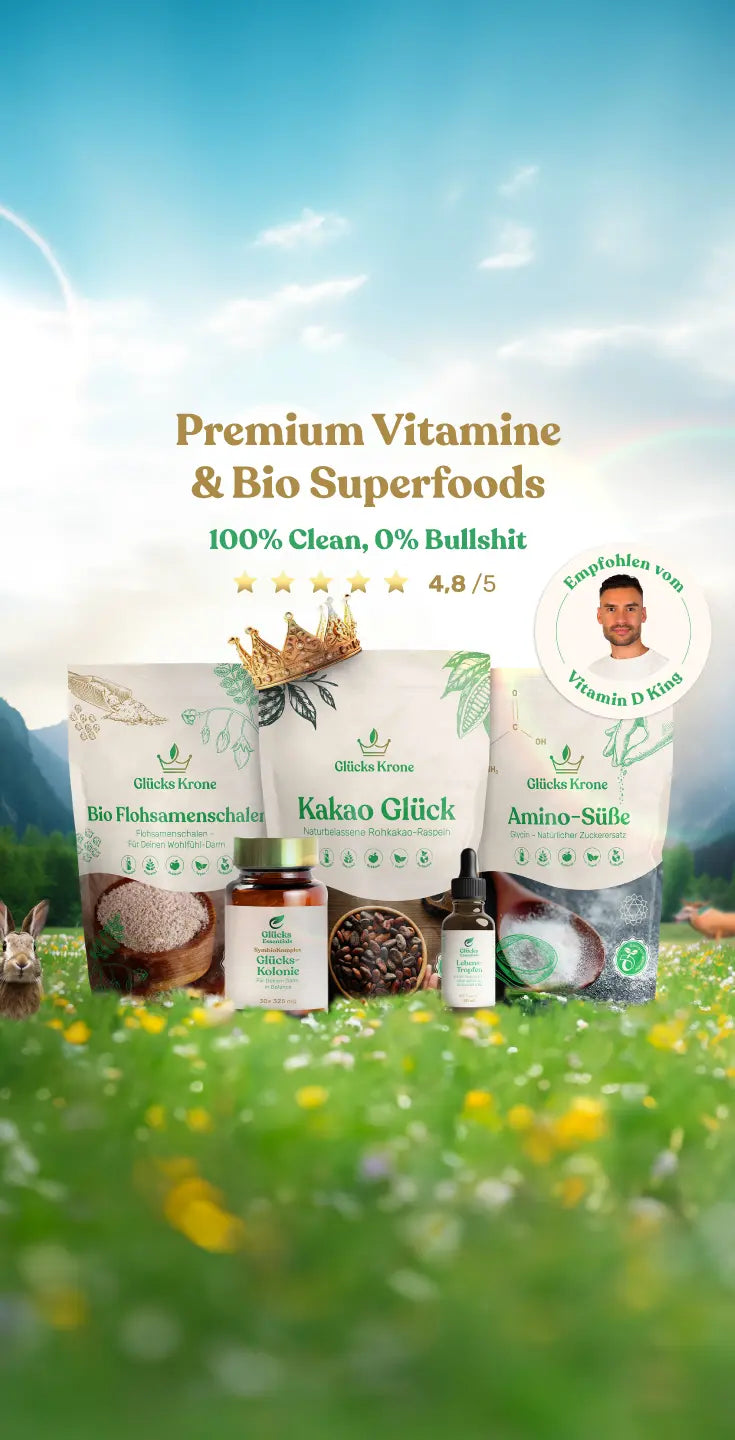 Unser Leben & Glück-Trio ist Deine perfekte, synergetisch wirkende Kombination unserer drei Superfoods: Lebens-Tropfen + Kakao-Glück + Glücks-Kolonie zur ganzheitlichen Stärkung Deines Immunsystems und für Deine maximale königliche Vitalität! 💛