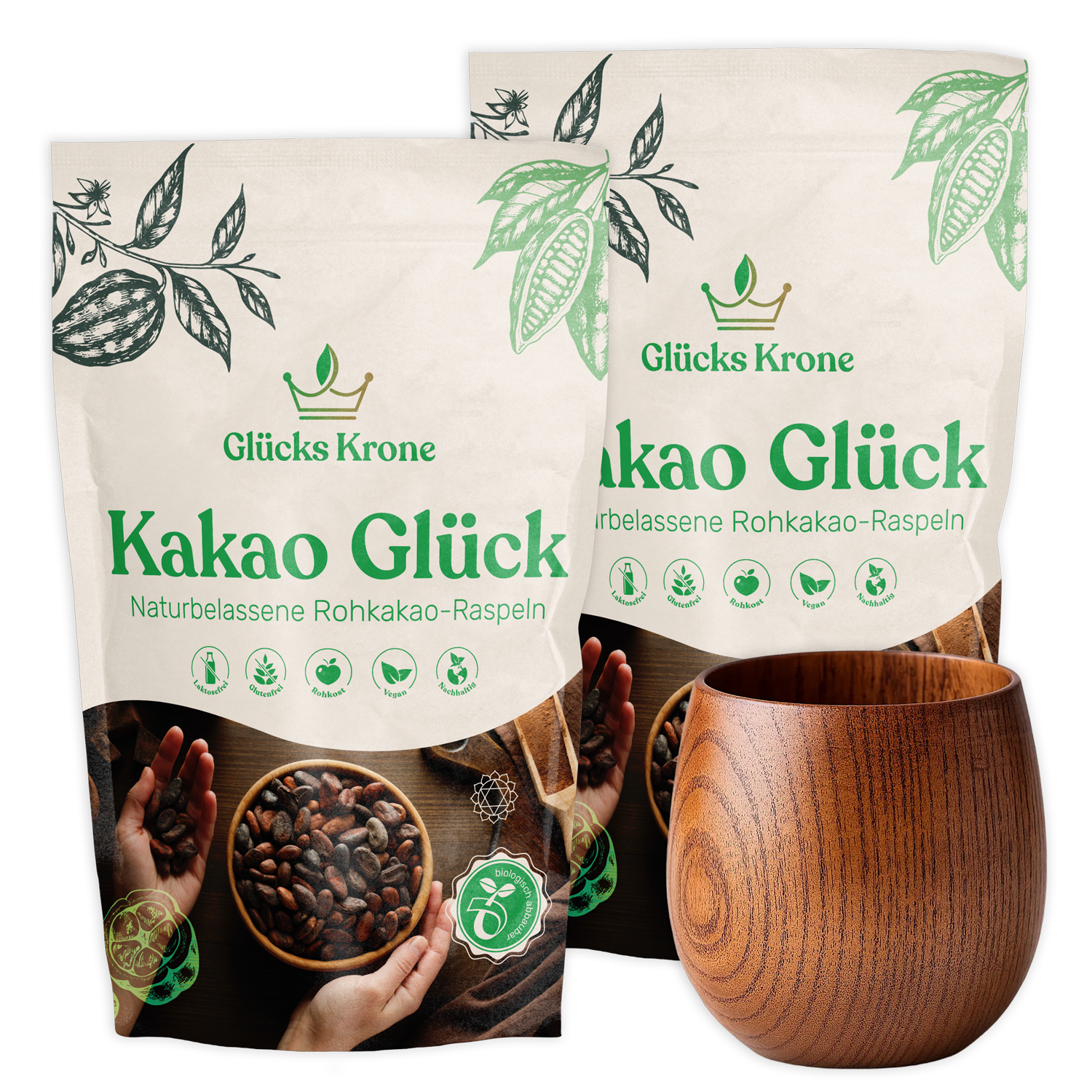 Zusätzlich zu 2x250g unseres Bio Kakao Glück (100% Bio Roh Kakao) bekommst du in diesem Bundle einen Eichenholz-Becher dazu – stilvoll trinken, bewusst genießen. Der edle Becher aus echtem Eichenholz macht jedes Kakao-Ritual zum Erlebnis: natürlich, hochwertig und ein echter Hingucker.