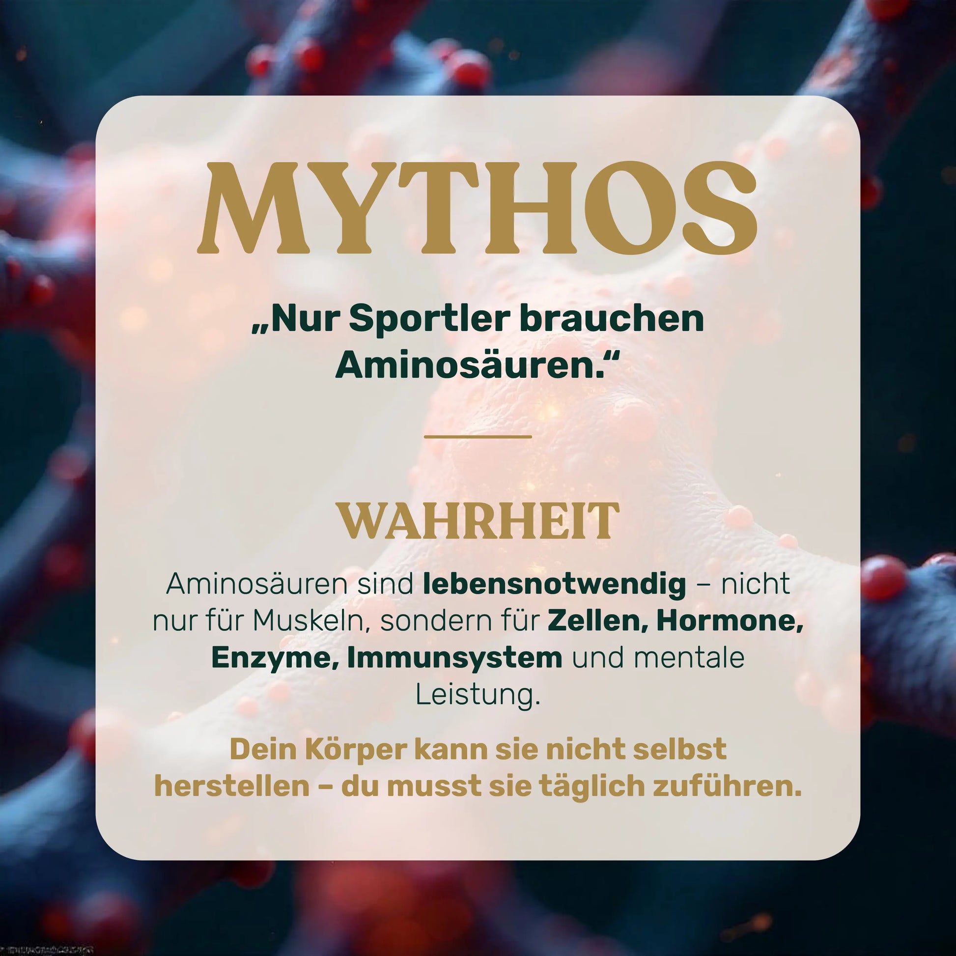 EAAs sind der Grundbaustein deiner Proteinsynthese – und damit entscheidend für körperliche Stärke, mentale Leistungsfähigkeit und eine schnelle Erholung im Alltag oder nach Belastung.